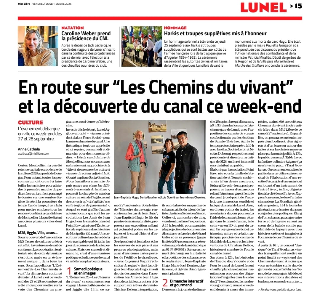 Midi Libre Lunel : En route sur “Les Chemins du vivant” et la découverte du canal ce week-endA Lunel, c’est ce week-end des 27 et 28 septembre qui a été choisi pour mettre sur la voie des Chemins un programme aussi dense qu’hétéroclite.
